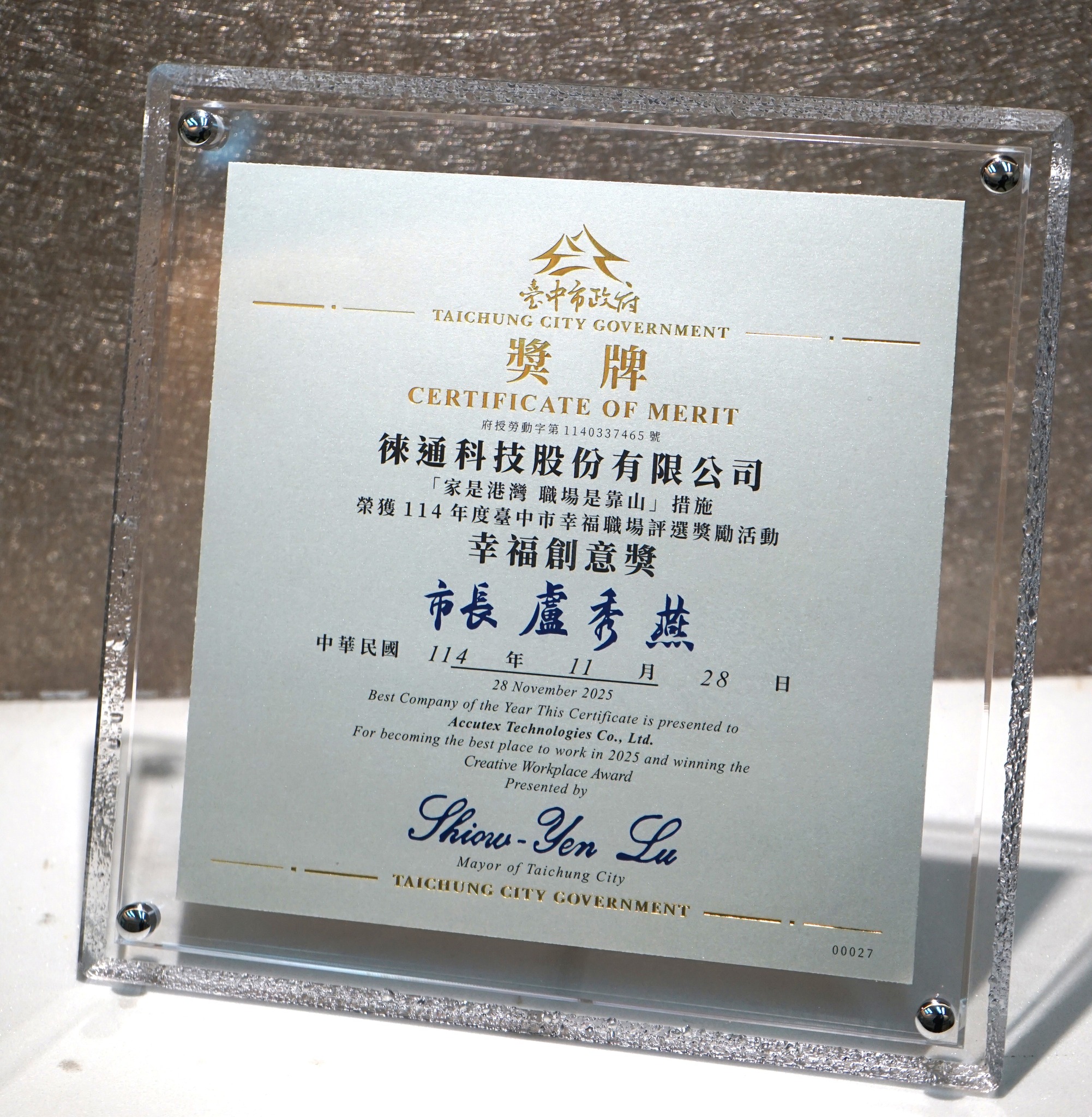 🏆 Taichung 114 Happy Workplace Award|Accutex Wins the “Creative Happiness Award”